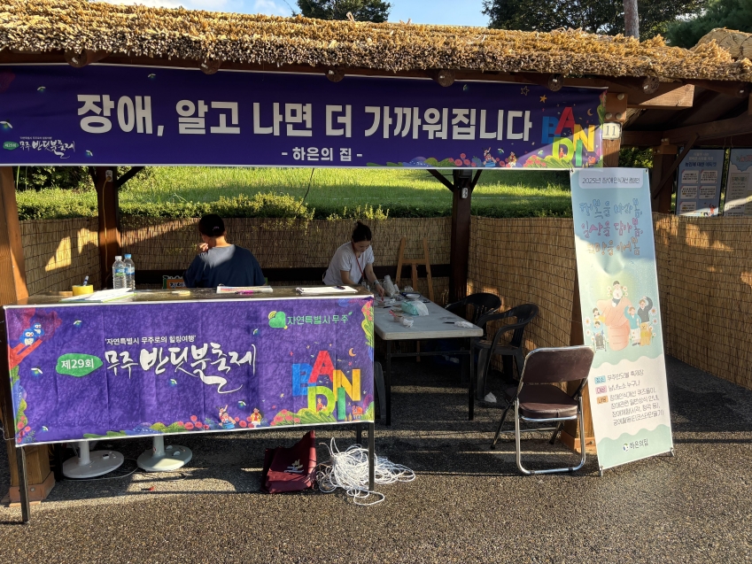 2025년 장애인식개선 캠페인 관리자 0 1 2025.09.13 14:35 2025년 장애인식개선 캠페인이 무주 반딧불 축제 기간동안 진행되었습니다. 특별히 장애인식개선 캠페인을 통해 하은의집의 역할, 활동모습들이 지역사회에 홍보되었으며, 장애인에 대한 편견 및 오해들이 해소되었습니다. 또한 장애인식개선 캠페인에 총 8일 동안 426명의 시민들이 참여하셨으며, 일부 시민들이 반디불 축제 중 제일 만족스러운 활동이라고 말씀하시는 등 성공적인 활동이 이루어졌습니다.